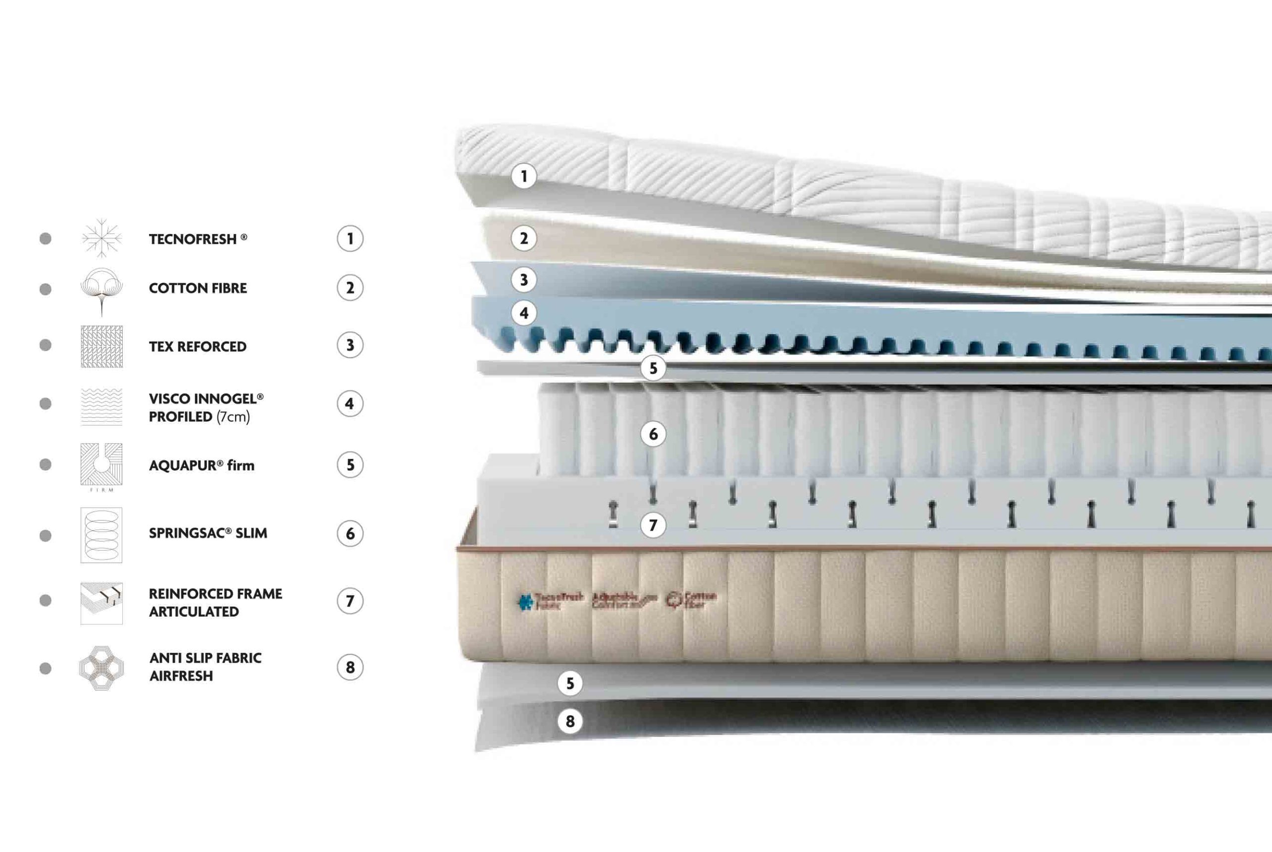 Sensación de confort profundo gracias a su generosa capa de 7 cm de viscoelástica Innogel® perfilada, aporta transpirabilidad y mejora la articulación del colchón, que se adapta con precisión a cada contorno del cuerpo. Esta acogida se equilibra con un núcleo de muelles ensacados que aporta estabilidad, ventilación y una excelente independencia de lechos. El marco perimetral de espuma HR perfilada permite que el colchón se articule con suavidad, y el tejido stretch con hilo frío. Un colchón articulable, ergonómico y diseñado para ofrecer confort sin interrupciones.