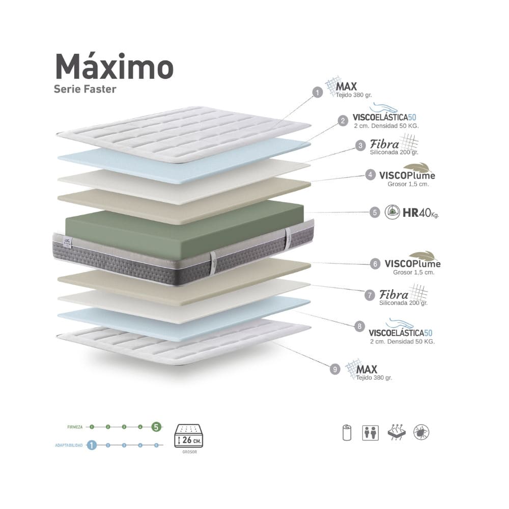 El colchón Máximo ha sido diseñado para quienes prefieren un descanso con alta firmeza y mínima adaptabilidad. Su núcleo de espuma HR de 40 kg. de densidad proporciona una base sólida y resistente, ideal para mantener una postura alineada durante toda la noche. Con 26 cm de grosor, cuenta con capas de viscoelástica de 50 kg y ViscoPlume en ambas caras, lo que permite utilizarlo por las dos caras y prolongar su vida útil, sin renunciar al confort inicial.