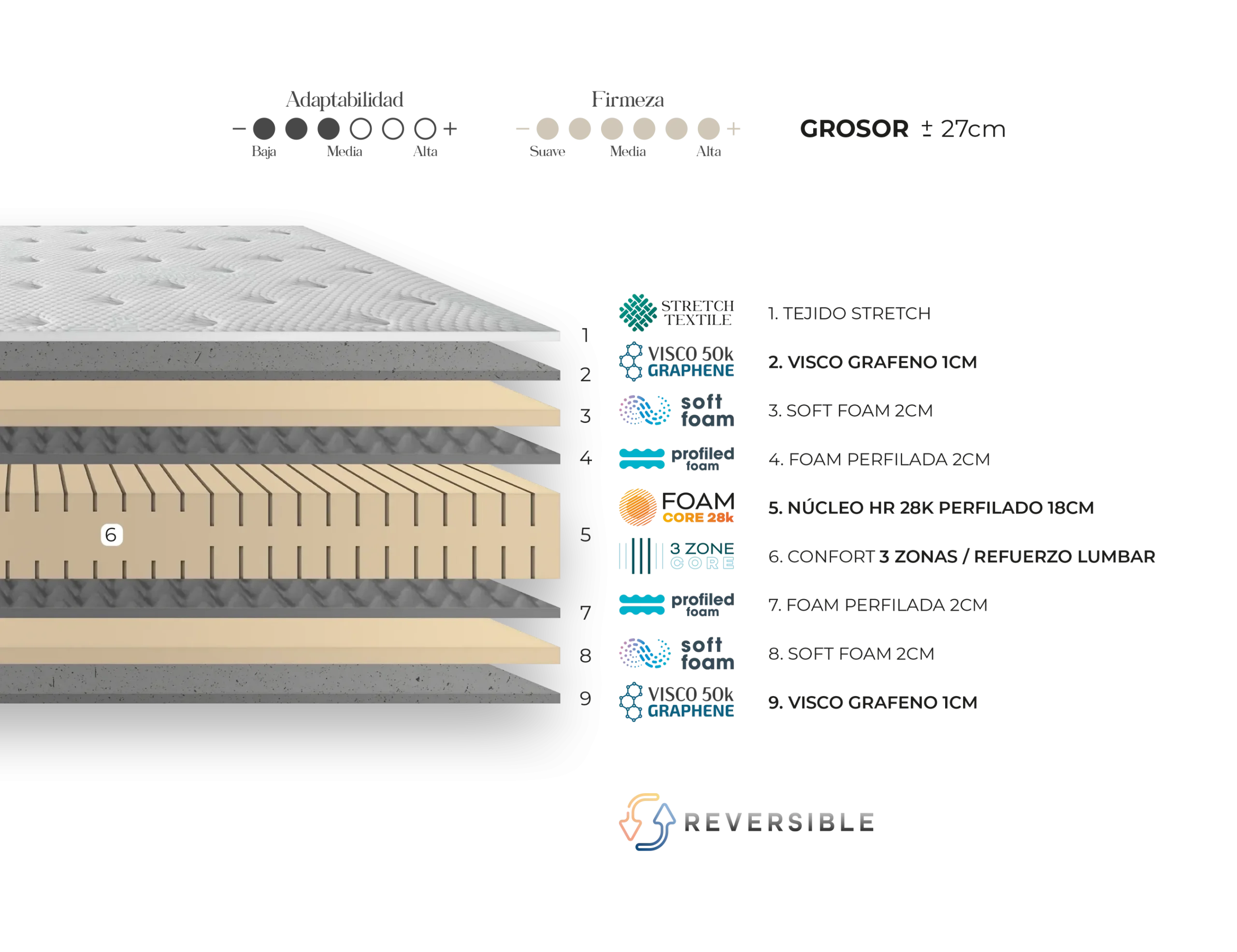 Además, este colchón cuenta con viscoelástica en ambas caras, lo que maximiza la adaptabilidad y brinda una acogida suave y envolvente al cuerpo. La viscoelástica permite reducir los puntos de presión, aliviando tensiones musculares y favoreciendo una experiencia de descanso reparador.
