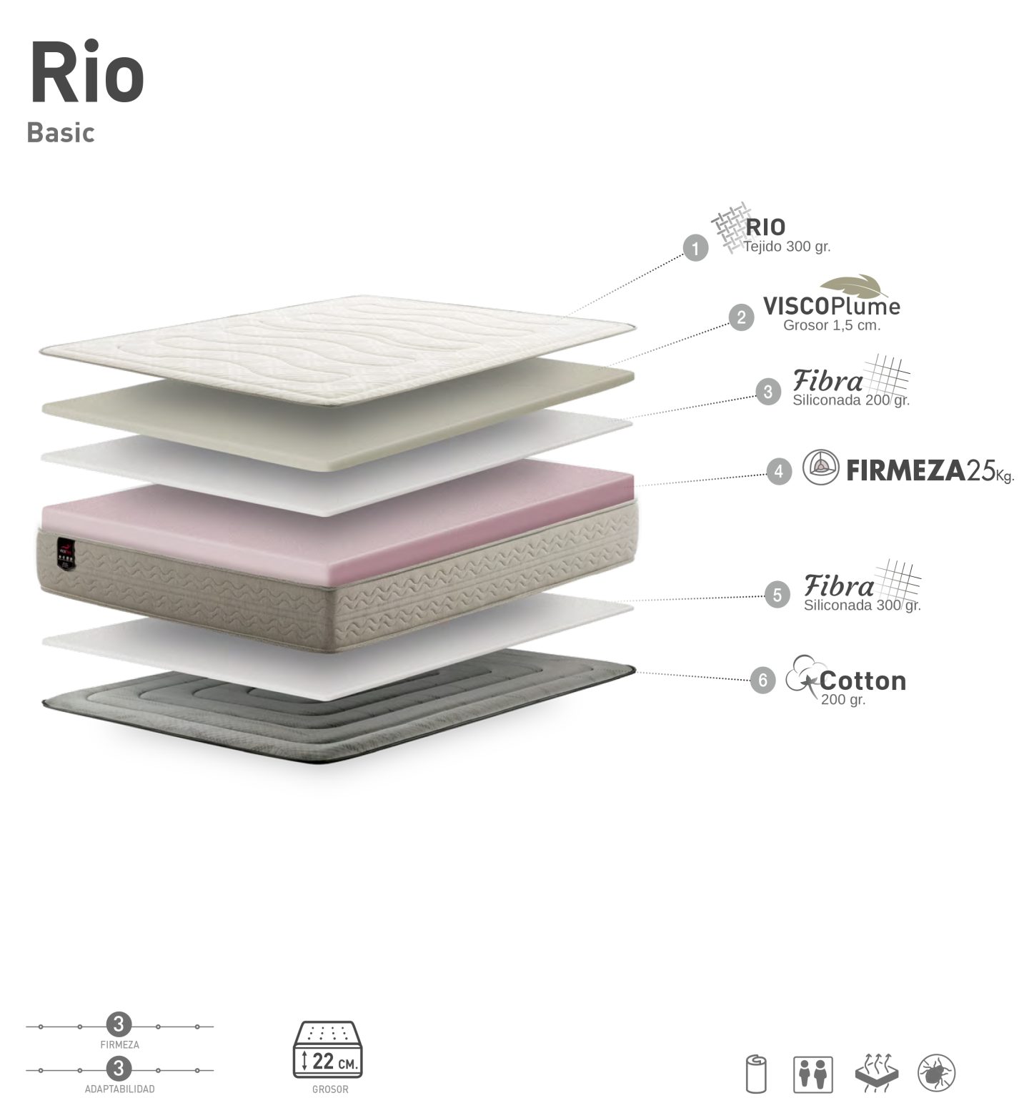 Río es un colchón de 22 cm de grosor, que está diseñado con un tejido stretch de calidad en la parte superior del colchón, este tejido está acolchado tapa a tapa para ofrecer a tu descanso una buena comodidad.