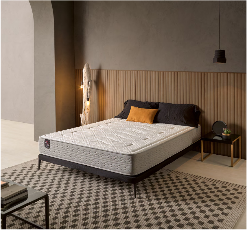 También en el interior del colchón, tenemos un núcleo de espuma Firmeza 25 kg combinado con varias capas de fibra siliconada y ViscoPlume, que hacen un equilibrio perfecto entre confort y firmeza para que puedas disfrutar de un descanso reparador cada noche.